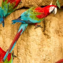 They travel in large flocks, moving between foraging spots and following the seasonal abundance of various fruits and nuts. Red and Green Macaws are capable of flying at speeds of up to 55 km/h! Like all macaws, they have a bare patch of skin on their face, which serves to exchange heat with the environment.