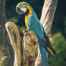 Macaws are highly social parrots that form groups of around 20 to 30 birds. Larger groups gather at clay licks on riverbanks. Their beak is adapted for eating seeds and nuts, providing them access to a wide variety of nuts that few other animals can reach. Macaws crack the hard shell between their upper and lower beak, using their tongue and palate to grind seeds for digestion. They consume seeds, fruits, nuts, and some vegetable matter. Macaws have zygodactyl feet (2 toes in front, 2 toes in back), enabling them to grasp onto their food and aiding in climbing. They possess a highly muscular gizzard to assist in the breakdown of extremely tough plant material.