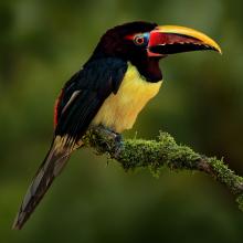The Green Araçari, the smallest breed of toucans, is named for the green feathers that cover its back. They weigh between 110 to 160 grams and measure approximately 30 to 40 centimeters in size.