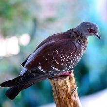 Speckled Pigeons have a reddish-purple plumage, with white speckles on their wings and a red patch of skin around their eyes. Flocks can consist of several hundred individuals and often gather on the ground to socialize and feed, especially in areas with abundant food. Their diet primarily consists of seeds, groundnuts, and cultivated grains. They are proficient flyers, often soaring high in the sky with steady wing beats.